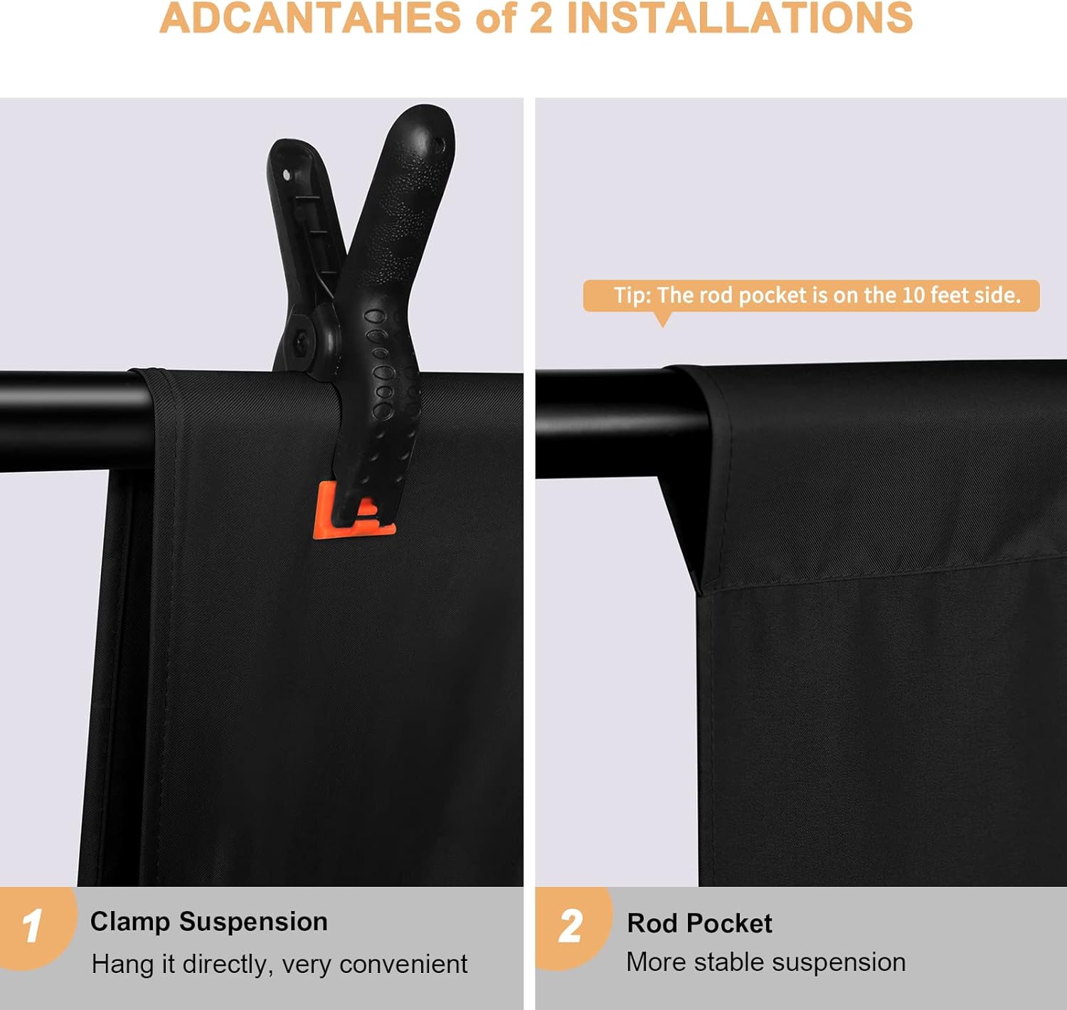 2. Rod pocket at 10ft long side, find a crossbar for hanging. PS: Crossbar was not included.